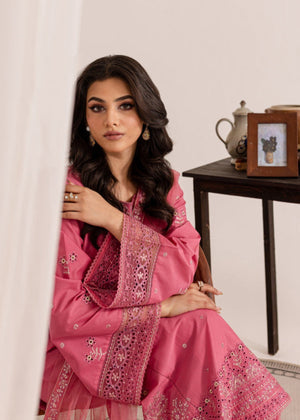 Additional Description: Radiate joy and festivity with a delightful display of pink hues on premium quality Pima lawn canvas, designed to captivate and dazzle. Finely designed straight paneled embroidered shirt and hem with embroidered composed side panels. Adornments further include embroidered sleeves with organza borders. Net dupatta with organza border all-around with embroidered patches at two sides. Paired with straight cambric trouser with pin tuck and lace detailing. Disclaimer: Colors may slightly vary due to lighting conditions and screen display settings.