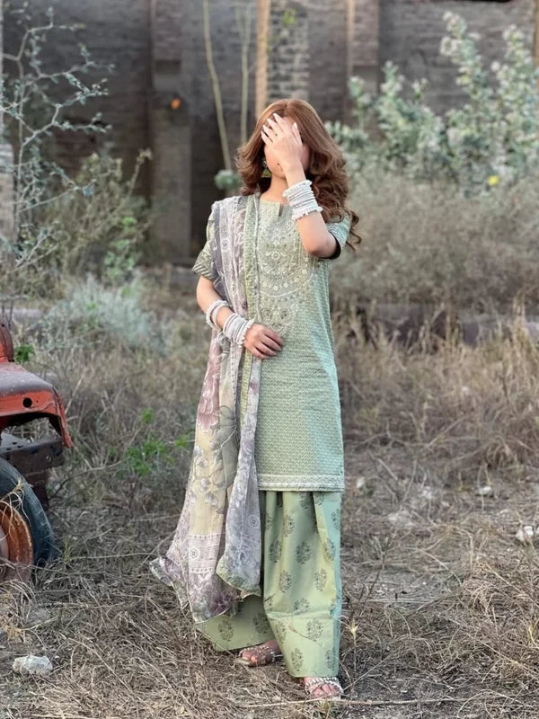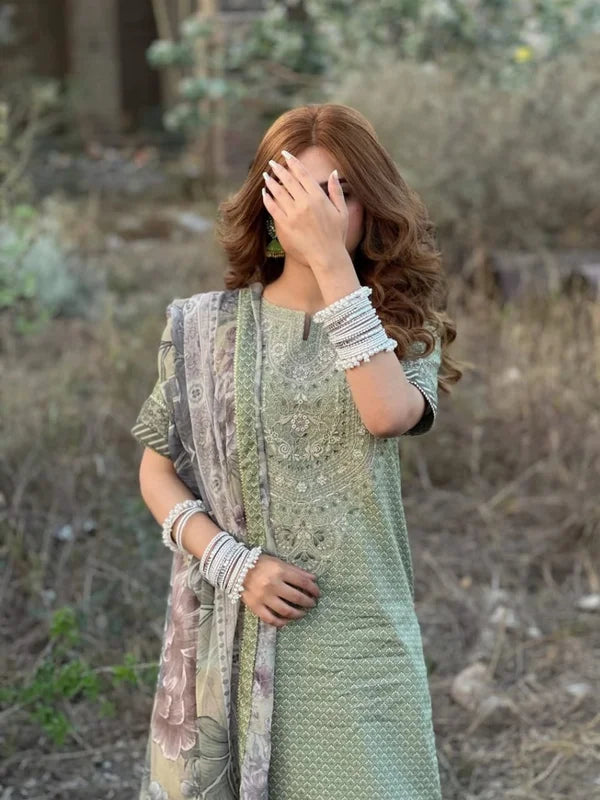 Make a statement with our three-piece embroidered ensemble in pistachio green featuring a lawn shirt, paired with a blended tissue dupatta and matching cotton trousers.